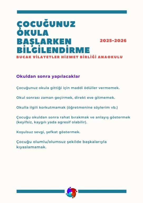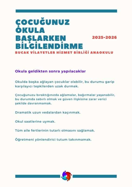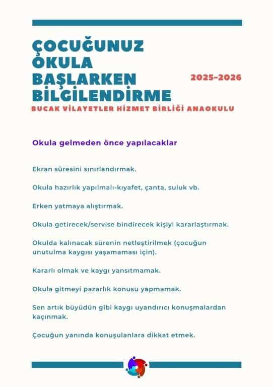 Hazırladığımız “Çocuğunuz Okula Başlarken Bilgilendirme” notumuzu dikkatle okuyunuz. Hep birlikte el ele vererek, çocuklarımız için mutlu ve verimli bir eğitim yılı geçirmek dileği ile 2025-2026 Eğitim-Öğretim Yılı hepimize hayırlı olsun.